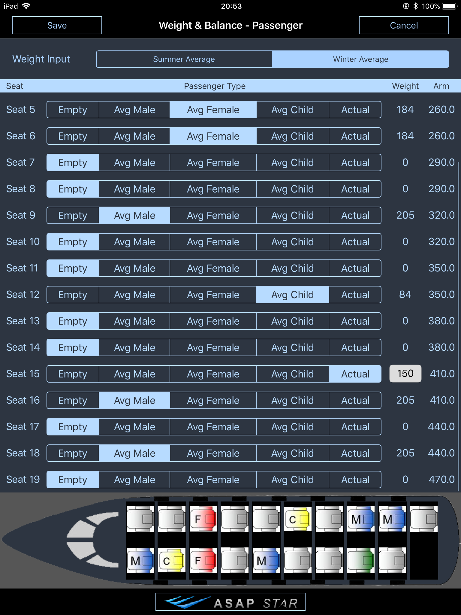 Seating is defined by seat name, arm, orientation, and row. Average weights for summer and winter can be used, or specific weights can be entered per seat. The program also allows you to specific whether the passenger is male, female, or a child. Each seat is displayed graphically with interactive images.
