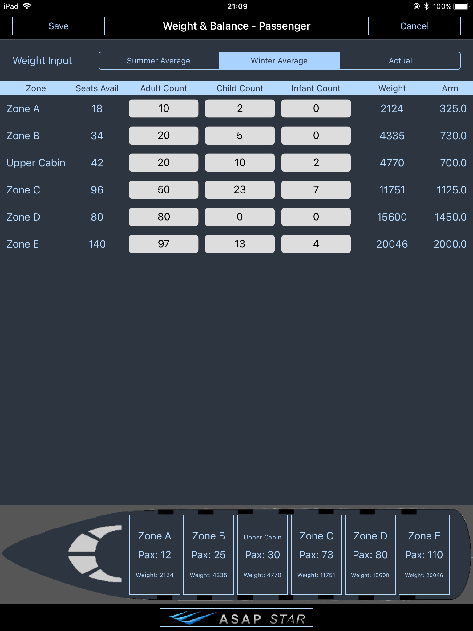 Zone seating is defined by the number of available passengers and centroid. There is no limit to the number of zones per passenger configuration. Summer and Winter average weights can be used, or you can use actual weight per zone. Zones are displayed graphically, and the zone borders progressively darken to show at a glance how full a cabin is.